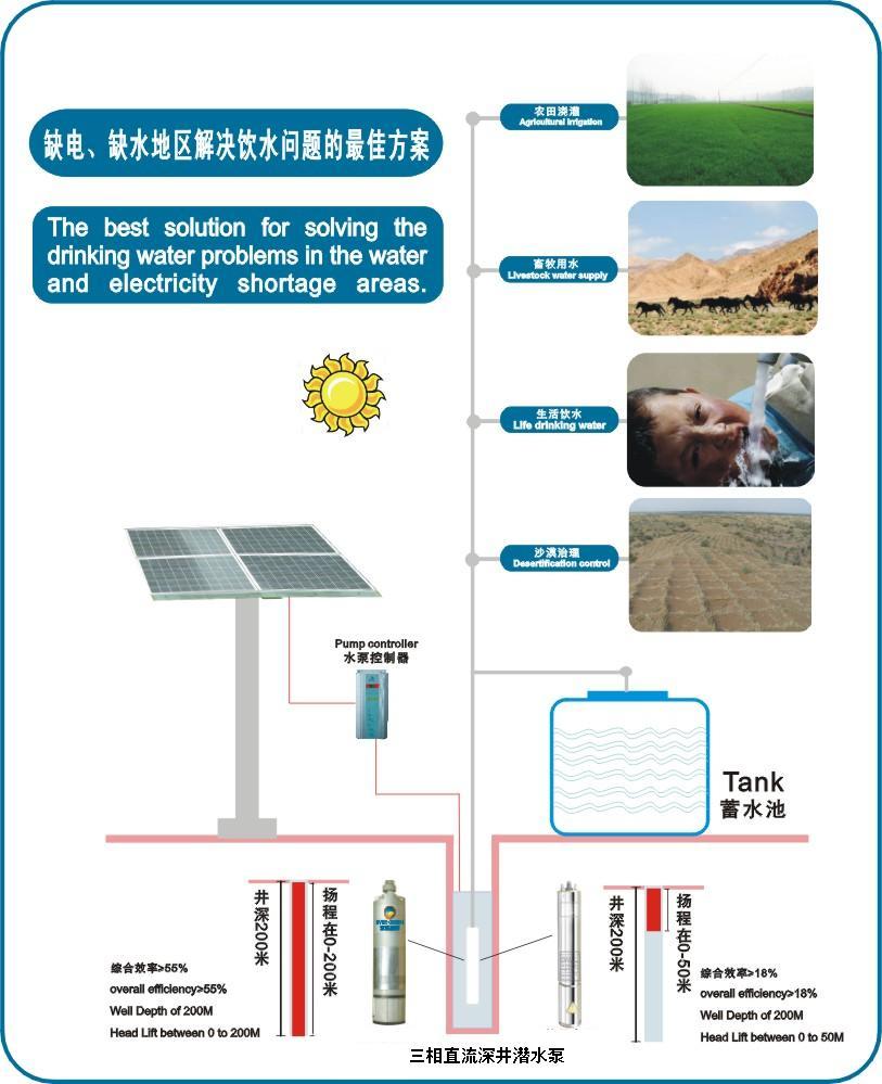 直流太陽(yáng)能水泵主要用于村莊或戶(hù)用供水、牲口飲水及農(nóng)場(chǎng)灌溉、野外宿營(yíng)供水、邊遠(yuǎn)無(wú)電地區(qū)供水、降低地下水位、增壓及各種工業(yè)用途;可以在小直徑4英寸的管道井或開(kāi)口中使用, 也可以在各種湖泊、水塘和河渠等水源中取水。