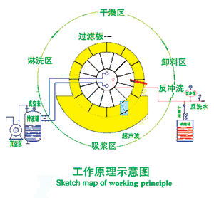 工作原理: 吸漿區:工作時浸沒在料漿的過濾板在毛細作用下結合真空壓力,表面吸附成一層濾餅,濾液通過濾板進分配閥至排液罐。 淋洗區:濾餅轉出料漿斗后,對濾餅進行噴淋洗滌。 干燥區:濾餅繼續在水環真空泵高真空力的作用下脫水。 卸料區:進入無真空的情況下,刮刀自動卸料。 反沖洗:工業水或濾液通過分配閥進入陶瓷板由內向外進行清洗。清洗堵塞的微孔。在陶瓷板使用一個周期后,采用超聲波配合低濃度酸混合清洗,保持陶瓷板的高效使用。 |