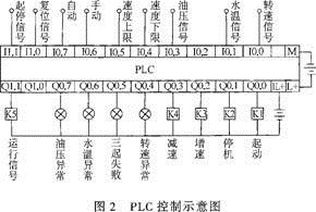 圖2為智能型柴油機泵組自動控制部分硬件線路電路圖。智能控制器采用德國西門子的S7—200系列產(chǎn)品,各種輸入信號通過開關(guān)按鈕及相關(guān)傳感器從現(xiàn)場采集。輸出信號通過各種執(zhí)行器控制柴油機的運行狀態(tài)。