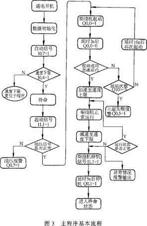 圖3為柴油機自動控制的基本功能程序流程圖,其中詳細地表達出了柴油機消防泵組接受起動信號起動柴油機至穩(wěn)定工況,及接受停止信號停止柴油機的全自動調(diào)節(jié)過程。采用西門子S7—200系列PLC,其強大的功能指令集和基于Windows的編稗工具.使得稗序編寫方便簡單。