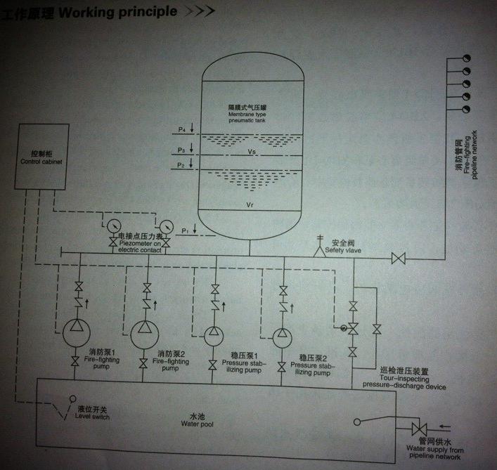 在消防供水狀態下,當壓力降到主消防泵啟動壓力P2時,主消防泵自動啟動向系統內供水。在主消防失靈而不能供水時,系統壓力繼續降到設計所允許的低供水壓力時,主消防泵自動啟動向系統內供水P1時,備用水泵自動啟動,確保消防正常供水。 | |