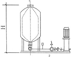 該設備采用囊式(隔膜)氣壓給水,當穩壓水泵處于低壓工作壓力P3時,由壓力繼電器傳感信號通過電控箱自動啟動水泵向罐內補水,且同時增壓,當壓力達到高工作壓力P4時,穩壓水泵自動停止,此時的系統壓力在低工作壓力P3和高工作壓力P4之間變化。
