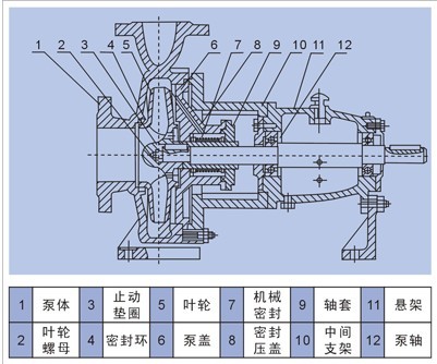 IH型泵是全國泵行業采用ISO國際標準聯合設計的系列產品,其主要由泵體、葉傳輸線、密封環、葉輪螺母、泵蓋、密封部件、中間支架、軸、懸架部件等組成。