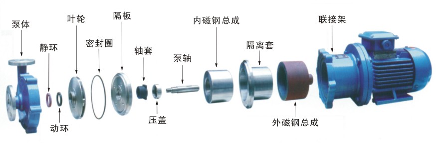 磁力泵主要構件是泵體、葉輪、內磁鋼、外磁鋼、隔離套、泵內軸、泵外軸以及滑動軸承、滾動軸承、聯軸器等組成。