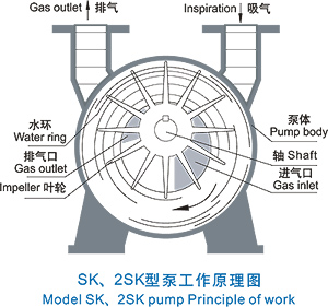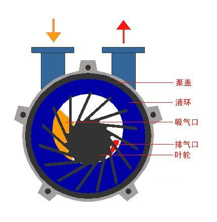 如圖:在泵體中裝有適量的水作為工作液。當葉輪按圖中順時針方向旋轉時,水被葉輪拋向四周,由于離心力的作用,水形成了一個決定于泵腔形狀的近似于等厚度的封閉圓環。水環的下部分內表面恰好與葉輪輪轂相切,水環的上部內表面剛好與葉片頂端接觸(實際上葉片在水環內有一定的插入深度)。此時葉輪輪轂與水環內界面之間形成一個月牙形空間,而這一空間又被葉輪葉片分成和葉片數目相等的若干個小腔。如果以葉輪的下部0°為起點,那么葉輪在旋轉前180°時小腔的容積由小變大,且與端面上的吸氣口相通,此時氣體被吸入,當吸氣終了時小腔則與吸氣口隔絕;當葉輪繼續旋轉時,小腔由大變小,使氣體被壓縮;當小腔與排氣口相通時,氣體便被排出泵外。