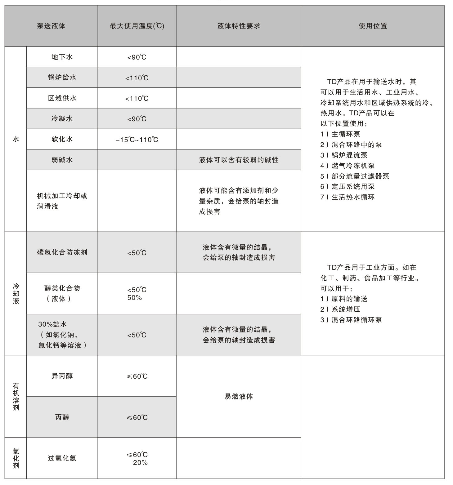 適宜在清潔、稀薄、非侵蝕、非易爆易燃,且不含有任何可能對(duì)泵造成機(jī)械或化學(xué)損害的固體顆粒和纖維的液體中使用。具體對(duì)液體要求及應(yīng)用如下;而在液體粘稠或密度較大情況下使用時(shí)會(huì)造成泵特性曲線的下降和能耗的增加。