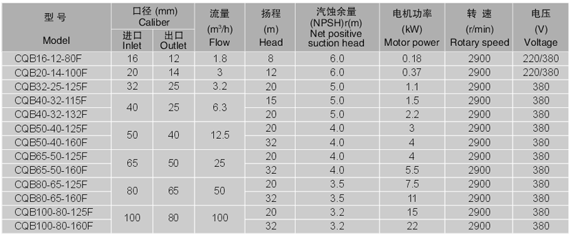 CQB-F型襯氟磁力泵的過流部件均采用“聚偏二氟塑料合金(PVF2)和超高分子量聚乙烯(UHMWPE)”制造。在常溫下,PVF2對鹵素、鹵代烴、強(qiáng)氧化劑、沸酸、堿等多種有機(jī)溶劑都有良好耐蝕性;UHMWPE對非氧化性酸(稀硫酸、硝酸及濃度較大的鹽酸、磷酸、氫氟酸、甲酸、乙酸)、氨和胺及各種堿、鹽溶液都有良好的耐蝕性,兩種材料都不耐強(qiáng)氧化性酸的腐蝕。氟合金泵的外殼為金屬材料,有足夠的強(qiáng)度承受管道以及外界的機(jī)械沖擊。傳動功率3kW以下的采用全氟結(jié)構(gòu)。
