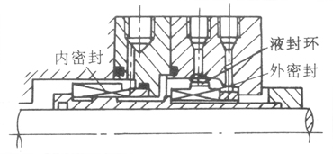 適用于高壓密封,一般串聯二級;亦可用于介質壓力不高,但密封要求嚴格的場合。兩密封間的封液利用液封環(見圖)進行強制循環,其壓力低于介質壓力,目的是潤滑密封。當內密封失效時,外密封仍可保證密封,提高密封可靠性。密封系統見表1—22方式52 | |