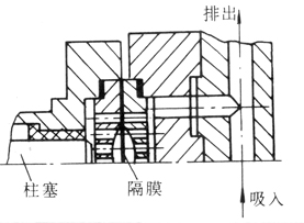 在柱塞泵缸前加一隔膜,柱塞在缸內做往復運動,使缸內油產生壓力,推動隔膜在隔膜腔內前后鼓動,達到吸