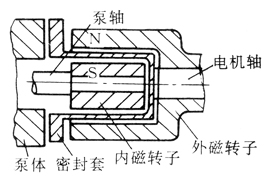 內磁轉子裝在泵軸端,并用密封套封閉在泵體內部,形成靜密封。外磁轉子裝在電機軸端,套入密封套外側,使內外磁轉子處于完全偶合狀態。內外轉子間的磁場力透過密封套而相互作用,進行力矩的傳遞