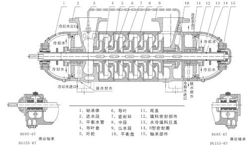 次高壓泵一般采用滑動軸承、稀油潤滑結構,DG85-6 7、DG155-67型泵可采用滑動軸承、 稀油潤滑,也可采用滾動軸承、干油潤滑結構,其余型號均采用滾動軸承、干油潤滑結構。中、低壓泵的主要零件材料一般采用優質鑄鐵,次高壓泵主要零件采用鑄鋼或不銹鋼。該系列泵通過彈性聯軸器由原動機直接驅動,從原動機方向看,泵為順時針方向旋轉。