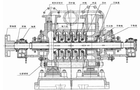 D、DG型臥式多級離心泵進、出水口均為垂直向上,通過拉緊螺栓將泵的進水段、中段、出水段、軸承體等泵殼體部分聯結成一體。根據泵的揚程選擇泵的級數。該系列泵轉子部分主要由軸及安裝在軸上的葉輪、軸套、平衡盤等零件組成,其中葉輪的數量根據泵的級數而定。軸上零件用平鍵和軸螺母緊固使之與軸聯為一體。整個轉子由兩端滾動軸承或滑動軸承支承。軸承按型號不同而定,均不承受軸向力,其軸向力由平衡盤平衡。泵在運行中允許轉子在泵殼中軸向游動,不能采用向心球軸承。滾動軸承用油脂潤滑,滑動軸承用稀油潤滑,并用油環進行白潤滑,循環水冷卻。泵的進水段、中段、出水段之間的密封面均采用二硫化鉬潤滑脂密封,轉子部分與固定部分之間裝有密封環、導葉套等進行密封, 當密封環和導葉套的磨損程度已影響泵的工作性能時應予更換。的密封形式有機械密封和填料密封兩種。泵采用填料密封時,填料環的位置安放要正確,填料的松緊程度必須適當,以液體能一滴一滴滲出為宜。泵各種密封元件裝在密封箱內,箱內要通入一定壓力的水,起水封、水冷或水潤滑作用。在軸封處裝有可更換的軸套,保護泵軸。