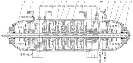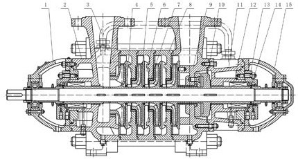 1 軸承體 6 導葉 11 尾蓋 2 進水段 7 密封環 12 填料密封部件 3 平衡水管 8 中段 13 水冷填料壓蓋 4 導葉套 9 出水段 14 O型密封圈 5 葉輪 10 平衡盤 15 軸承部件