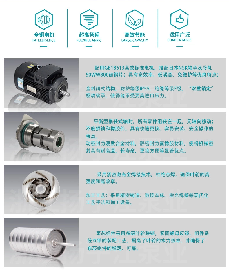 QDL輕型多級離心泵主要零部件如葉輪、導流器、泵軸、外圓筒用不銹鋼制造,QDL(N)系列所有過流部件均為不銹鋼制造,具有良好的耐腐蝕性能,采用硬質合金軸承及機械密封,剛性聯軸器傳動,具有體積小、重量輕、抗腐蝕、振動小、噪音低、占地面積小、使用壽命長,外形美觀等特點,特別是高效、節能等優點。