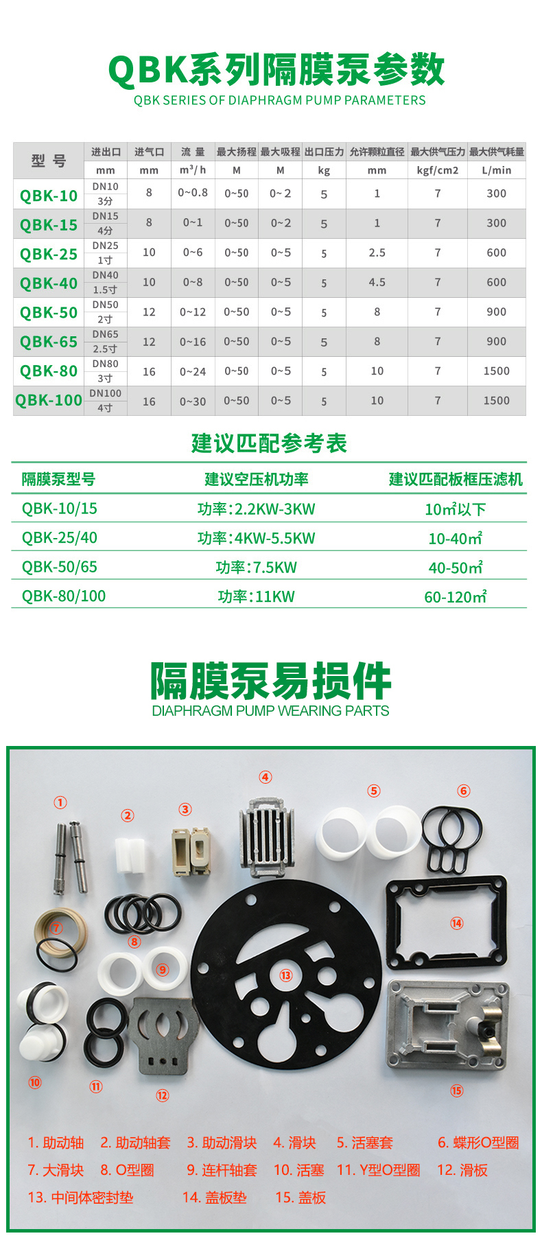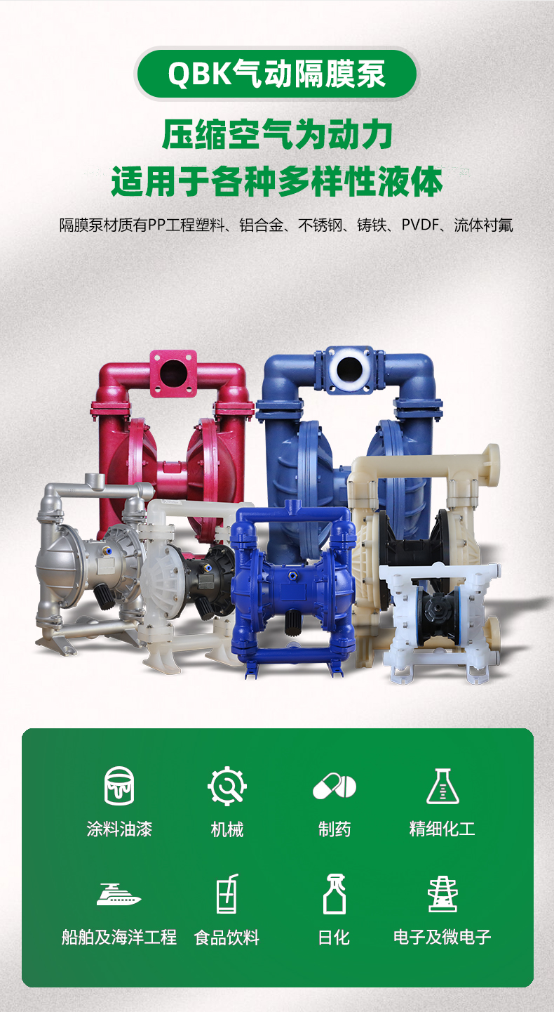 QBK氣動隔膜泵是我公司開發的第三代氣動隔膜泵,具有使用壽命長,不會停頓等優點,它既能抽送流動的液體,又能輸送一些不易流動的介質,具有自吸泵、潛水泵、屏蔽泵、泥漿泵和雜質泵等輸送機械的許多優點。