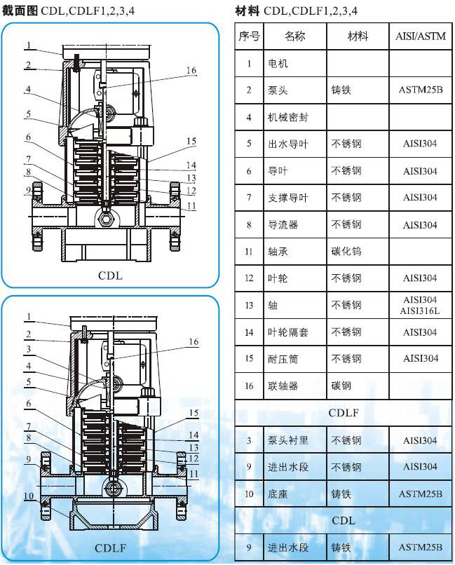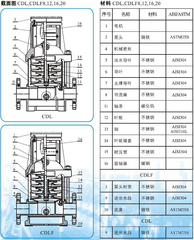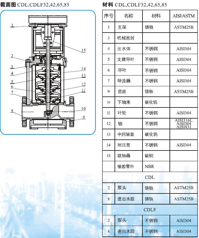 CDLF系列輕型不銹鋼立式多級管道泵(以下簡稱泵)是吸取了國內外先進技術而設計制造的非自吸立式多級管道泵,采用標準立式電機和快裝式機械密封,更換非常方便。泵的過流部分均采用不銹鋼(304\316)材料制成,可適用于輕度腐蝕性介質。該產品可替代國外CR、CRN等同類產品。產品投放市場后,以其高效節能、質量可靠、使用范圍廣等特點,深受廣大用戶的喜愛。