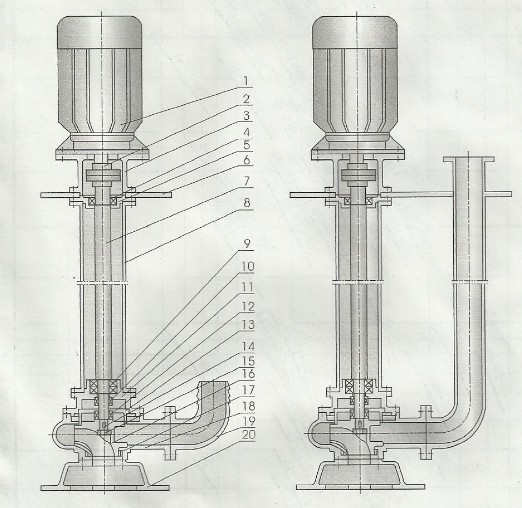 1、電機;2、聯軸器;3、電機座;4、上軸承;5、上軸承座;6、安裝盤;7、加長軸;8、支撐管;9、下軸承;10、上機械密封;11、油室;12、機械密封;13、后蓋板;14、鍵;15、葉輪螺母;16、葉輪;17、密封環;18、泵體;19、出水管;20、底盤