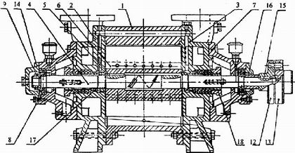 1.泵體 2.后蓋 3.前蓋 4.泵軸 5.平鍵 6.葉輪 7.軸承瓦架 8.滾珠軸承 9.園螺母 12.泵聯軸器 13.電機聯軸器 14.軸承蓋 15.鍵 16.定位圈 17.軸套 18.填料壓蓋