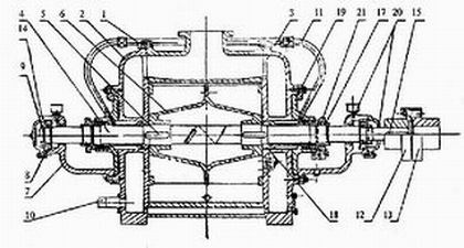 1.泵體 2.后蓋 3.前蓋 4.泵軸 5.平鍵 6.葉輪 7.軸承瓦架 8.滾珠軸承 9.園螺母 10.進水管 11.水封管 12.泵聯軸器 13.電機聯軸器 14.軸承蓋 15.鍵 17.軸套螺母 18.軸套 19.填料涵 20.毛氈圈 21填料函壓蓋
