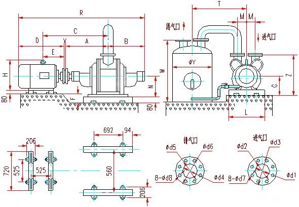 1.葉輪 2.泵體 3.水環 4.進氣管5.吸氣孔 6.排氣孔 7.排氣管 a.底腳 b.真空度調節閥門 c.進氣管 d. 吸氣孔e.橡皮閥 f.排氣管 g.排氣孔 u.進水孔