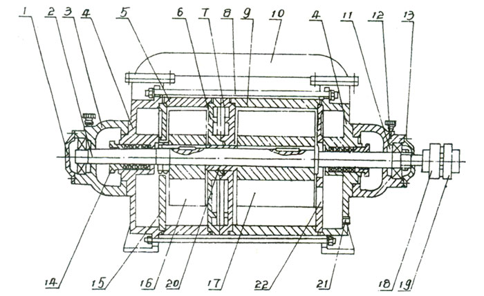 1、后軸承壓蓋 2、軸 3、軸承架 4、前后端蓋 5、短泵體 6、中間壁(B) 7、中間壁(A) 8、拉緊螺栓 9、長泵體 10、連通管 11、調整墊 12、油杯 13、前軸承壓蓋 14、填料壓蓋 15、后蓋園盤 16、短葉輪 17、長葉輪 18、泵聯軸器 19、電機聯軸器 20、軸套 21、進水孔 22、前蓋園盤