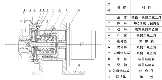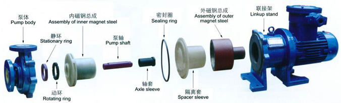 驅(qū)動裝置采用主動磁鐵聯(lián)軸器直接裝在電機(jī)軸上,泵室完全封閉,通過磁力偶合間接驅(qū)動泵軸上帶磁鐵的葉輪旋轉(zhuǎn)結(jié)構(gòu)緊湊、安全節(jié)能。堅(jiān)固耐用的泵體結(jié)構(gòu)雖然接觸液體部分是氟塑料,但泵外殼是金屬材料,故泵體足以承受管道的重量及抵受機(jī)械性沖擊。氟塑料磁力泵由泵、磁力傳動器、電動機(jī)三部分組成。關(guān)鍵部件磁力傳動器由外磁轉(zhuǎn)子、內(nèi)磁轉(zhuǎn)子及不導(dǎo)磁的隔離套組成。當(dāng)電動機(jī)帶動外磁轉(zhuǎn)子旋轉(zhuǎn)時,磁場能穿透空氣隙和非磁性物質(zhì),帶動與葉輪相連的內(nèi)磁轉(zhuǎn)子作同步旋轉(zhuǎn),實(shí)現(xiàn)動力的無接觸傳遞,將動密封轉(zhuǎn)化為靜密封。由于泵軸、內(nèi)磁轉(zhuǎn)子被泵體、隔離套完全封閉,從而徹底解決了“跑、冒、滴、漏”問題,消除了煉油化工行業(yè)易燃、易爆、有毒、有害介質(zhì)通過泵密封泄漏的安全隱患,有力地保證了職工的身心健康和安全生產(chǎn)。