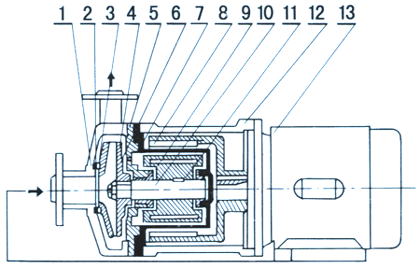 8 | 外磁鋼總成 | 9 | 內磁鋼總成 | 10 | 泵軸 | 11 | 軸套 | 12 | 聯接架 | 13 | 電機 | 14 |